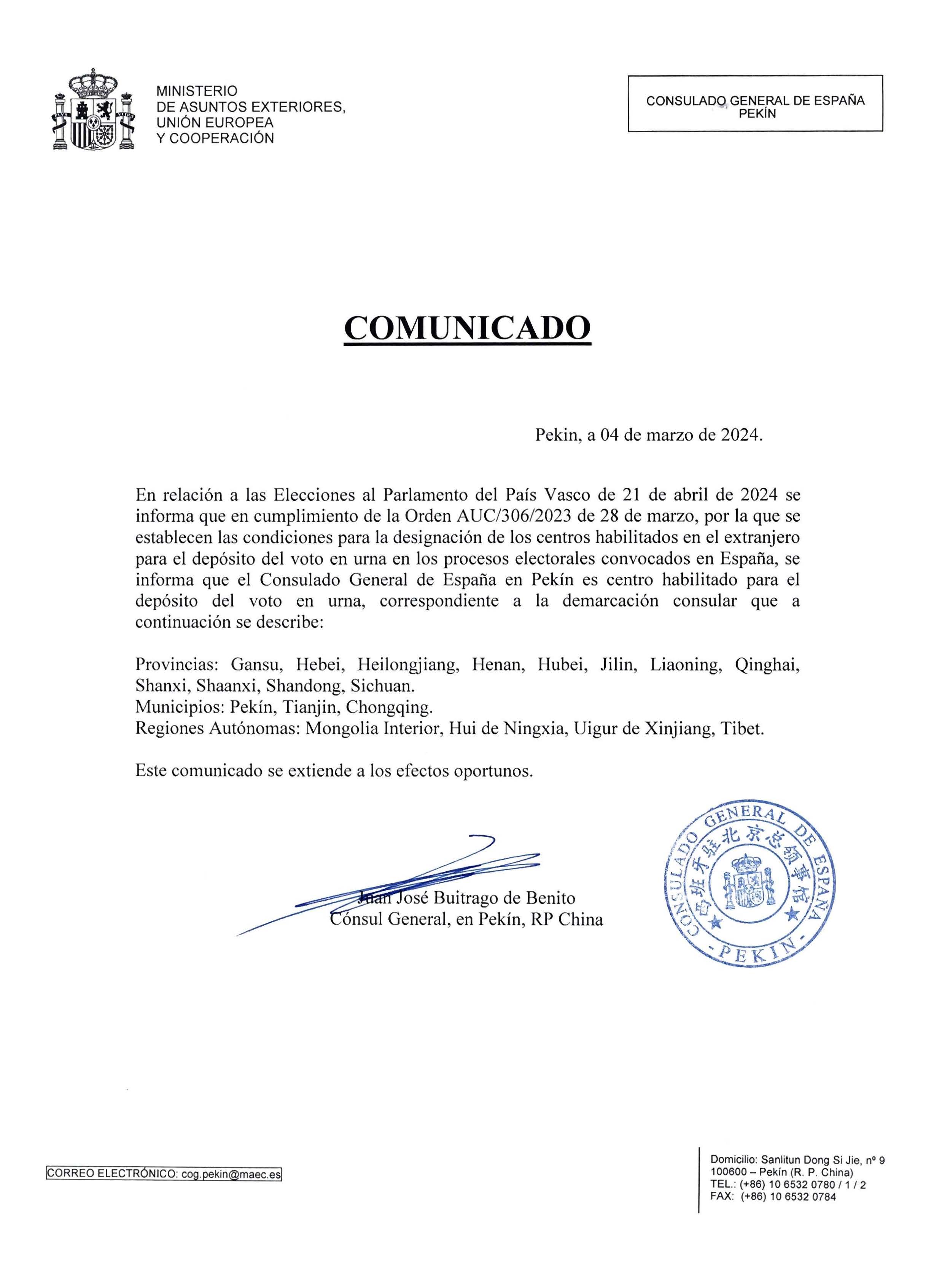 En relación a las Elecciones al Parlamento del País Vasco de 21 de abril de 2024, se informa que el Consulado General de España en Pekín es centro habilitado para el depósito del voto en urna, correspondiente a la demarcación consular que a continuación se describe: