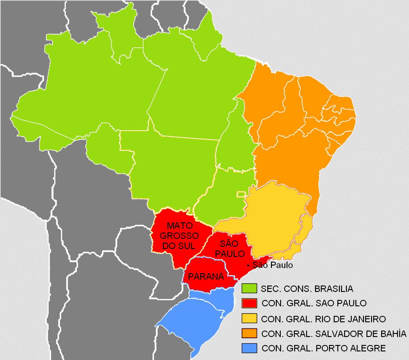 En Brasil existen, además, la Sección Consular de la Embajada de España en Brasilia y los Consulados Generales de España en Porto Alegre, Río de Janeiro y Salvador de Bahía, cuyas demarcaciones son las que se detallan en el mapa.