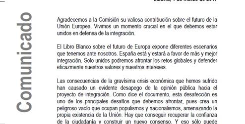 El Libro Blanco sobre el futuro de Europa expone diferentes escenarios que tenemos ante nosotros. España está y estará a favor de más y mejor integración. Solo unidos podremos afrontar los retos globales y defender eficazmente nuestros valores y nuestros intereses.