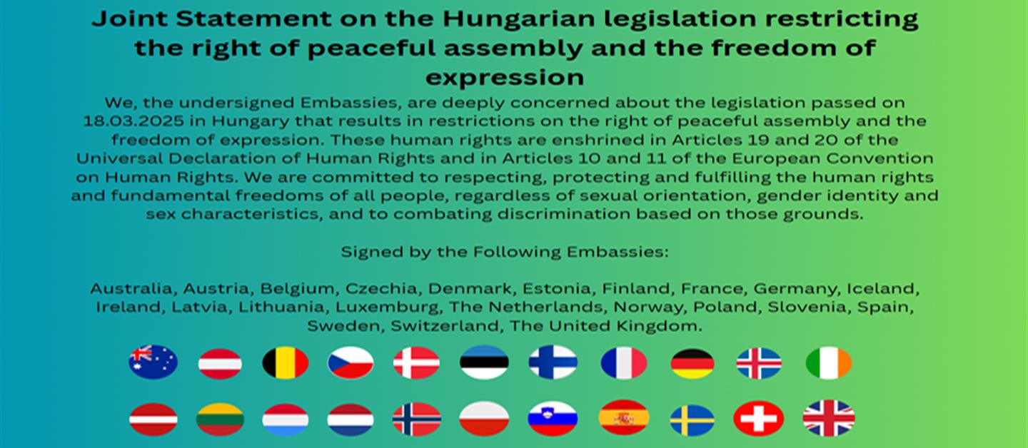 We, the undersigned Embassies, are deeply concerned about the legislation passed on 18.03.2025 in Hungary that results in restrictions on the right of peaceful assembly and the freedom of expression.