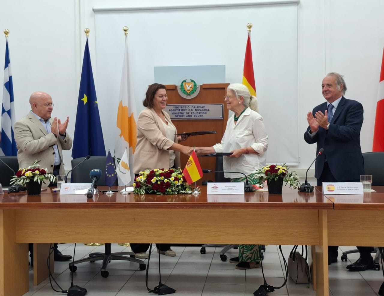 En este curso académico que arranca, los alumnos de los centros educativos públicos de todo Chipre que estudian español podrán acceder a la certificación oficial DELE (Español como Lengua Extranjera). La firma ayer del Memorándum de Entendimiento entre el Ministerio de Educación, Deporte y Juventud y el Instituto Cervantes permitirá en los Lyceum, ya durante el curso 2025-2026, la implantación piloto de este sistema de certificación reconocido internacionalmente y en línea con el Marco Común Europeo de Referencia para las Lenguas del Consejo de Europa.