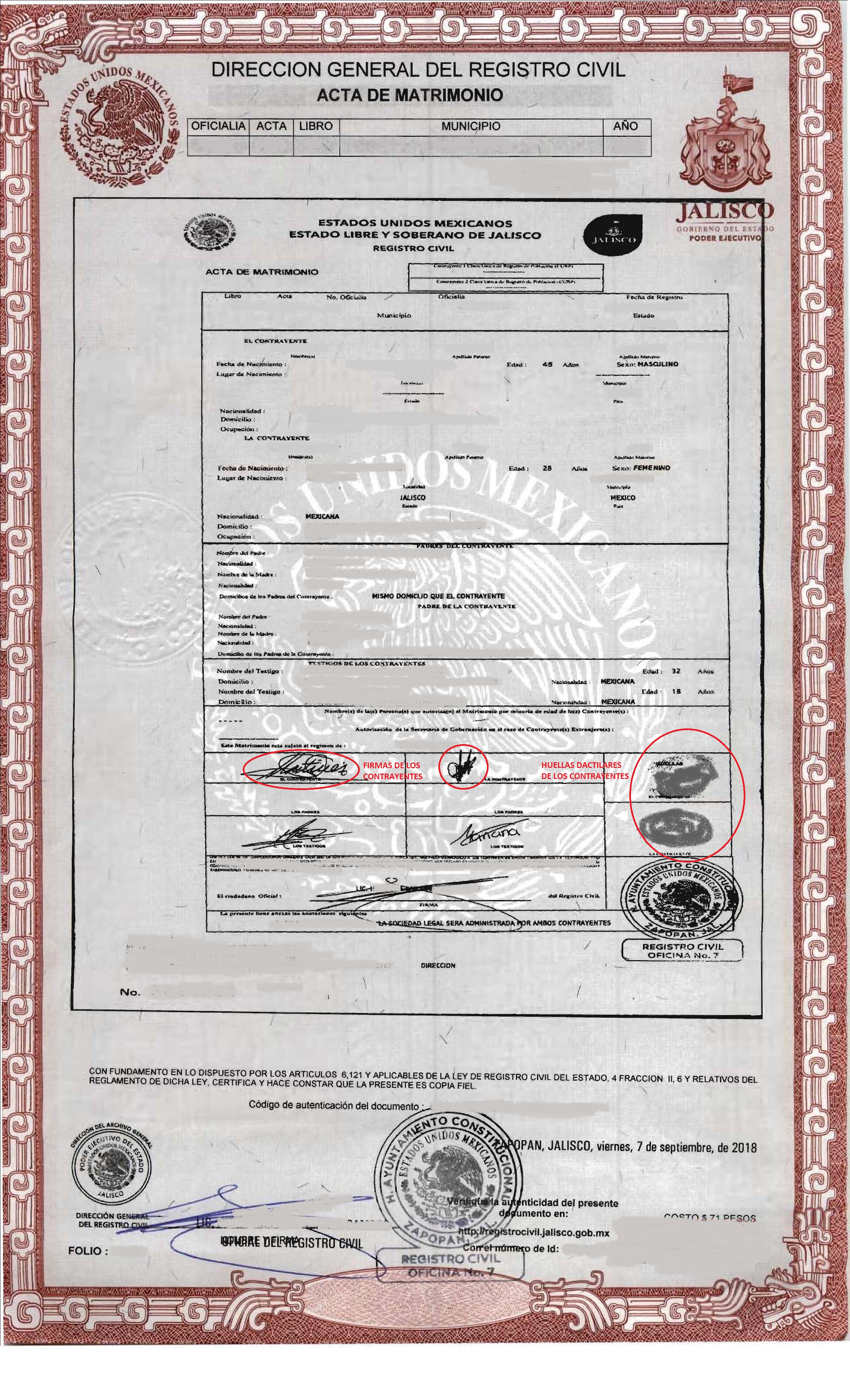 -) y apostillada del progenitor que no tenga la nacionalidad española. NO SE ADMITEN EXTRACTOS. 7. Acta literal (copia fiel) del matrimonio de los progenitores del interesado, apostillada (si no fuera un acta española de matrimonio), siempre y cuando existiera el matrimonio en el momento del nacimiento del solicitante. Ver ejemplo de acta mexicana de matrimonio