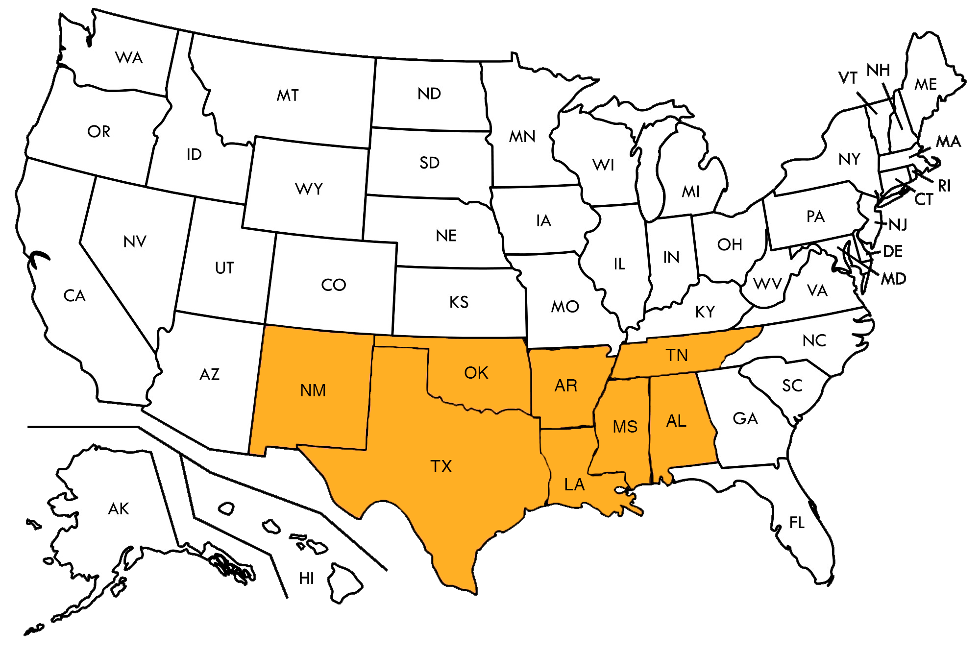 Texas, Nuevo México, Oklahoma, Luisiana, Arkansas, Tennessee, Alabama y Misisipi.