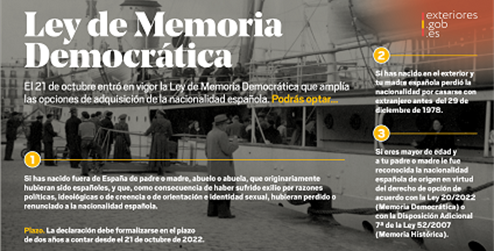 La Ley 20/2022, de 19 de octubre, de Memoria Democrática (BOE de 20 de octubre) establece, en su disposición adicional octava, la posibilidad de adquirir la nacionalidad española para: