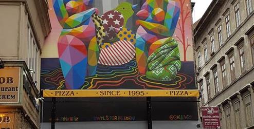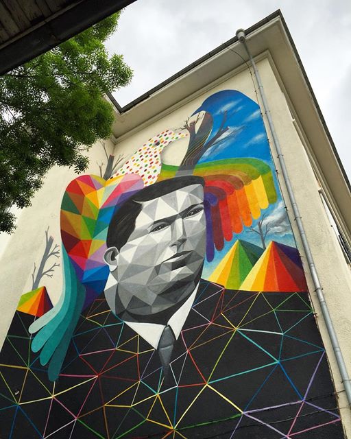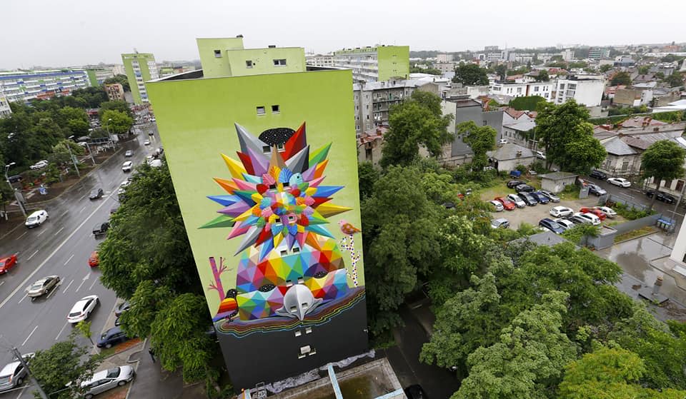 Okuda es un artista con una larga trayectoria en el campo de la pintura mural. Sus obras pueden verse en países como India, Estados Unidos, Japón, Chile, Brasil, Sudáfrica, México al igual que en gran parte del continente europeo, entre otros. Este artista de origen cántabro ha logrado crear un estilo propio basado en formas geométricas y estampados multicolores así como en escalas de grises, creando así una identidad propia dentro del mundo del arte mural.